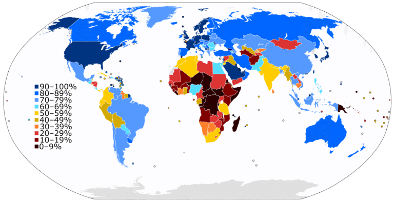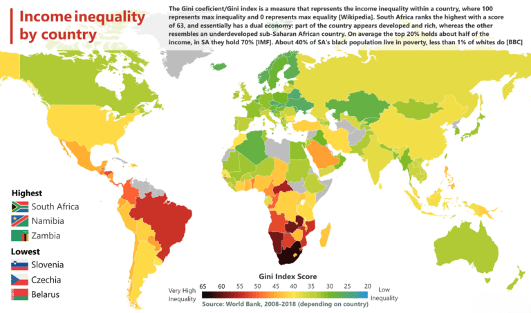 The map shown here presents a world map color-coded by the Gini index to illustrate income inequality by country. The Gini index here shows us that 100 indicates maximum inequality and 0 maximum equality. The data is sourced from World…