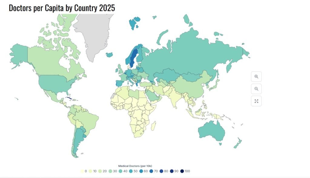 This global map ultimately illustrates that doctor density correlates strongly with educational investment and economic development. Countries with darker shading share common characteristics: numerous well-funded medical schools, competitive but accessible admissions processes, comprehensive training programs, and policies that retain graduates in domestic practice.